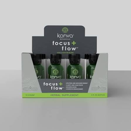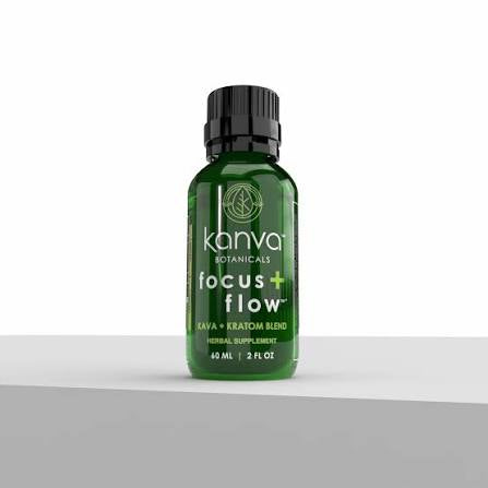 Kanva Botanicals Focus & Flow is a 2oz liquid herbal shot containing a blend of kava root extract and kratom, designed for mental clarity, mood elevation, and natural energy